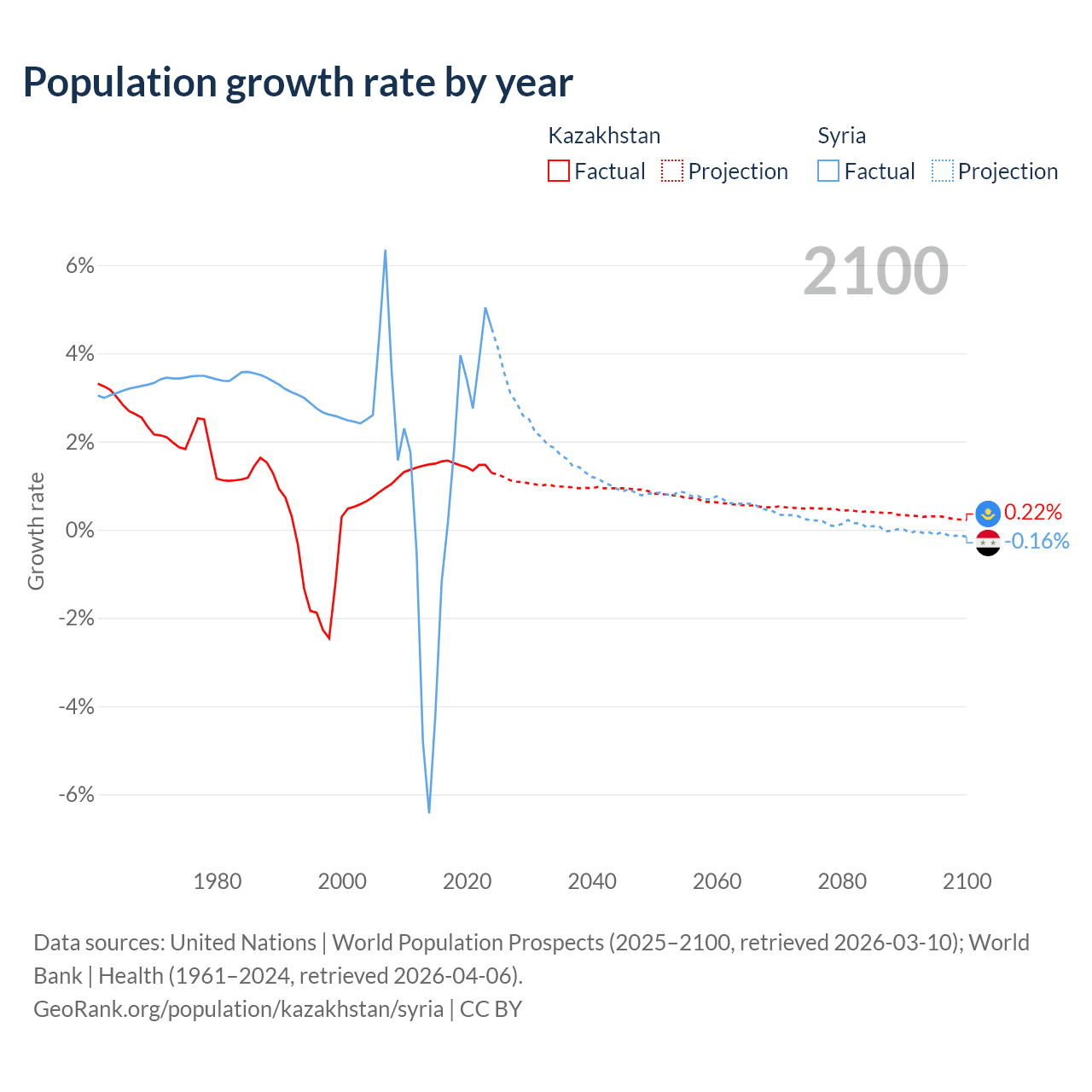 - For the last 10 years, Kazakhstan has had an average growth rate of +1.46% per year vs +1.25% in Syria.