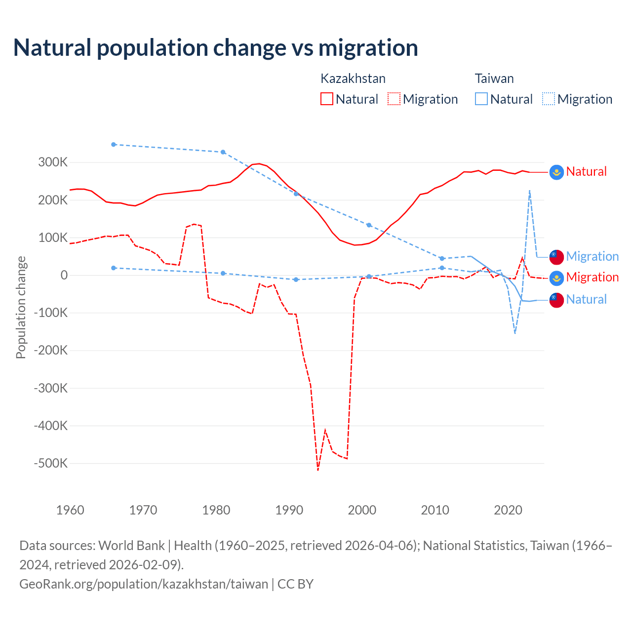 Over the last 10 years, 98.7% of the population change in Kazakhstan is from natural causes (a gain of 2,743,094 people) and 1.33% is from migration (a gain of 36,908 people). In Taiwan 56.7% is from natural causes (a loss of 57,467 people) and 43.3% is from migration (a gain of 43,884 people).