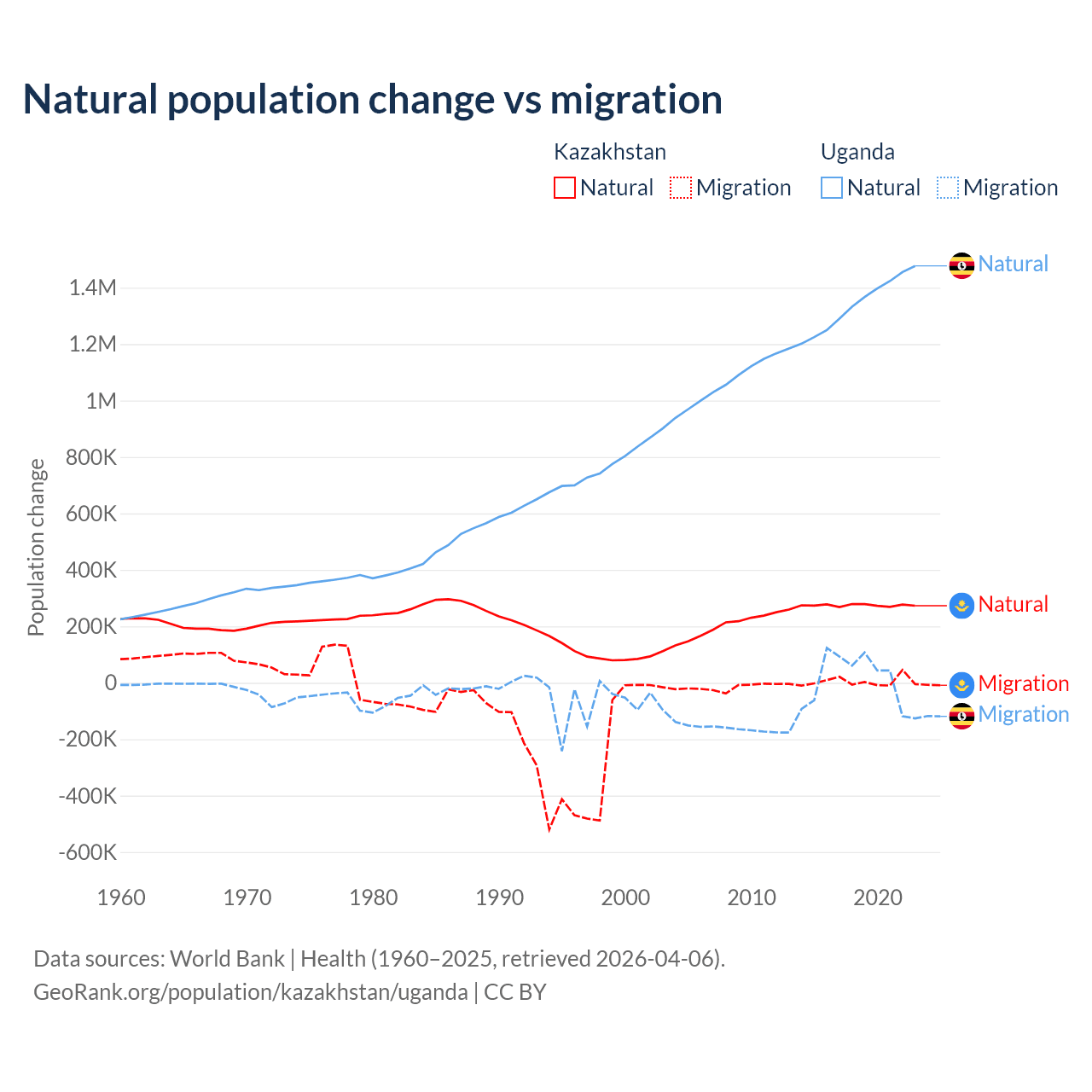 Over the last 10 years, 98.7% of the population change in Kazakhstan is from natural causes (a gain of 2,743,094 people) and 1.33% is from migration (a gain of 36,908 people). In Uganda 99.5% is from natural causes (a gain of 13,419,712 people) and 0.53% is from migration (a gain of 71,457 people).