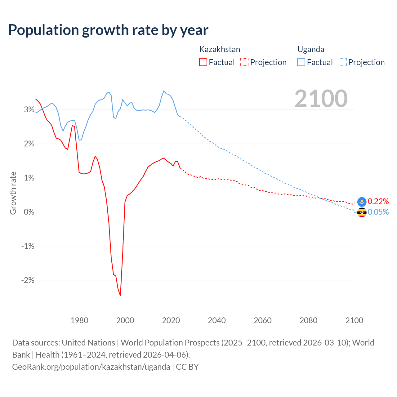 - For the last 10 years, Kazakhstan has had an average growth rate of +1.46% per year vs +3.21% in Uganda.