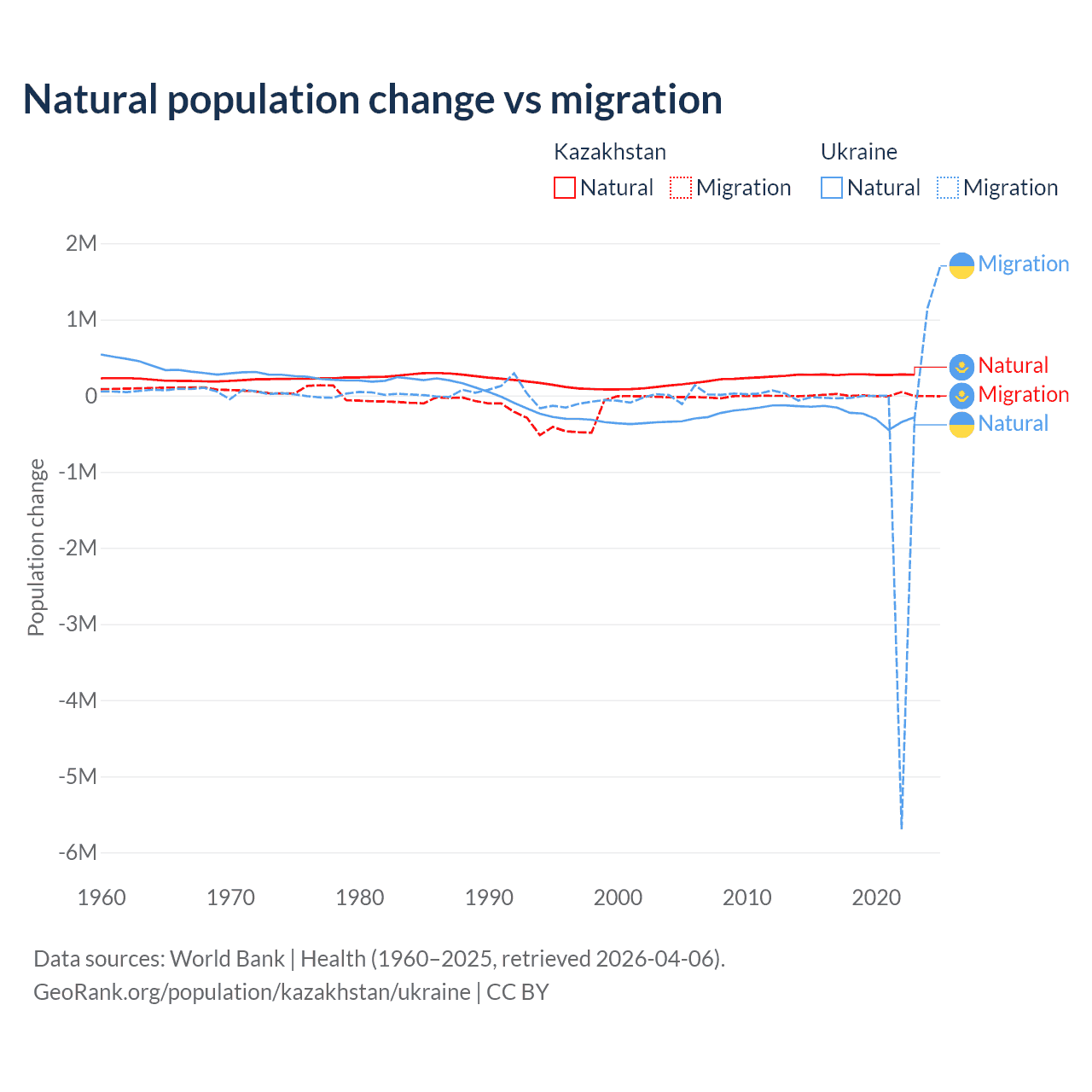 Over the last 10 years, 98.7% of the population change in Kazakhstan is from natural causes (a gain of 2,743,094 people) and 1.33% is from migration (a gain of 36,908 people). In Ukraine 28.2% is from natural causes (a loss of 2,435,153 people) and 71.8% is from migration (a loss of 6,198,995 people).