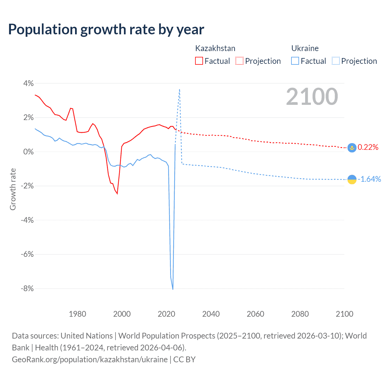- For the last 10 years, Kazakhstan has had an average growth rate of +1.46% per year vs -1.74% in Ukraine.