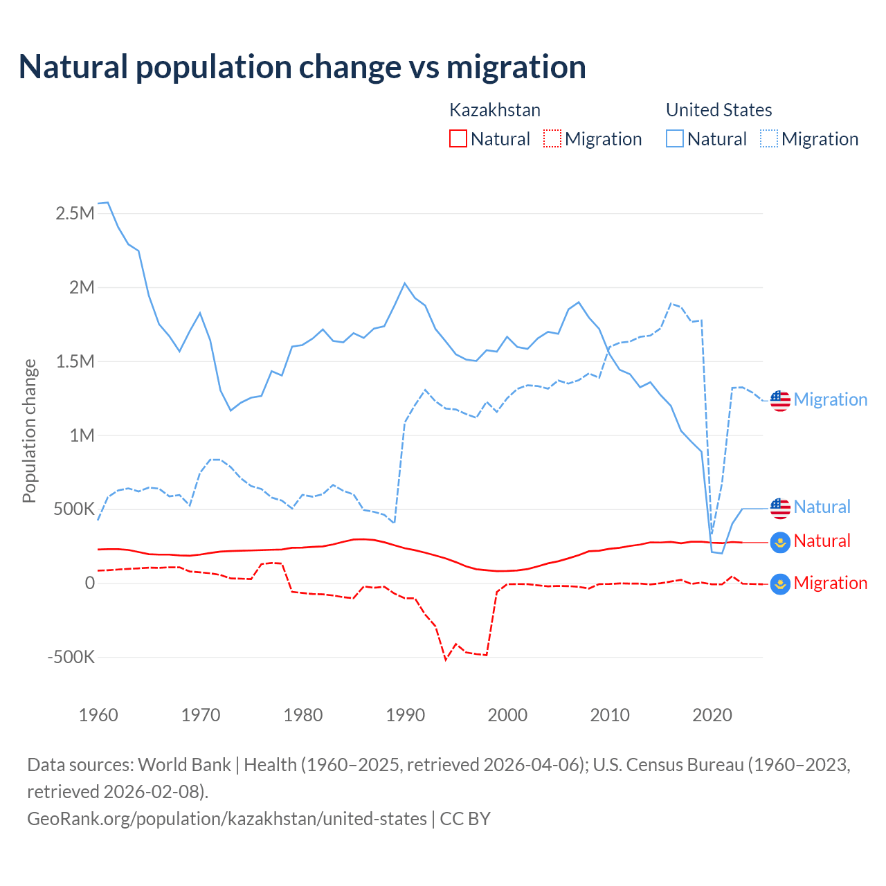 Over the last 10 years, 98.7% of the population change in Kazakhstan is from natural causes (a gain of 2,743,094 people) and 1.33% is from migration (a gain of 36,908 people). In the United States 35.8% is from natural causes (a gain of 8,005,866 people) and 64.2% is from migration (a gain of 14,334,286 people).