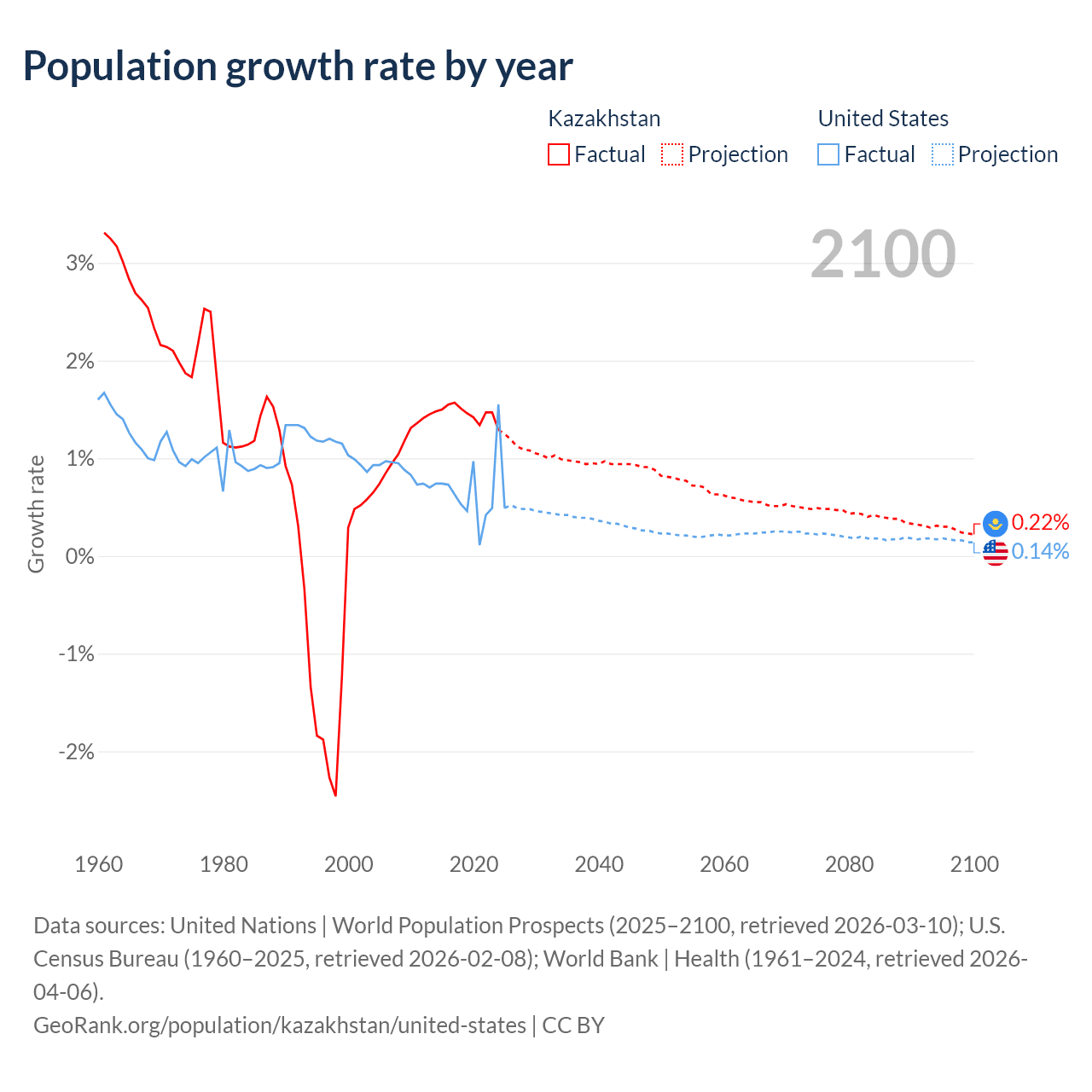 - For the last 10 years, Kazakhstan has had an average growth rate of +1.46% per year vs +0.65% in the United States.