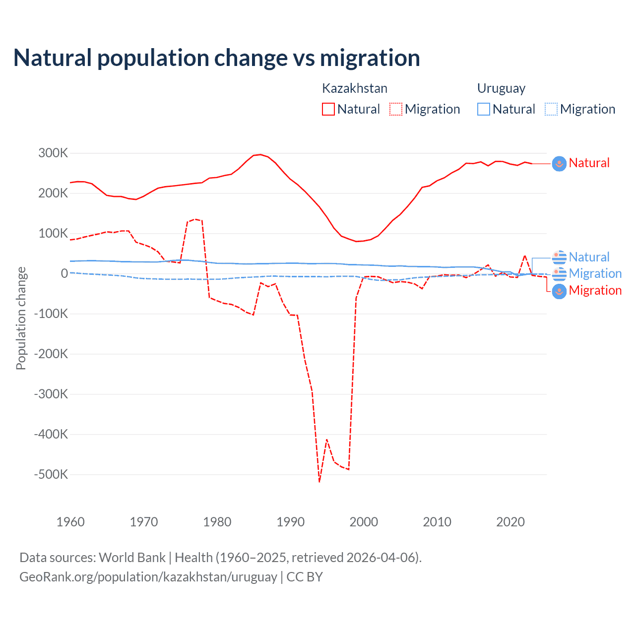 Over the last 10 years, 98.7% of the population change in Kazakhstan is from natural causes (a gain of 2,743,094 people) and 1.33% is from migration (a gain of 36,908 people). In Uruguay 70% is from natural causes (a gain of 64,303 people) and 30% is from migration (a loss of 27,501 people).