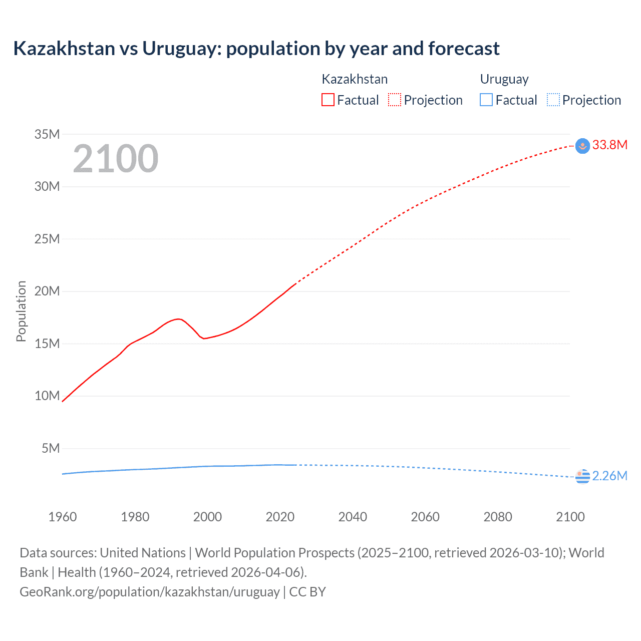 The latest officially reported population of Kazakhstan was 20,592,571 in 2024 vs 3,386,588 people in Uruguay in 2024. In 2026, based on the adjusted UN estimation, the current Kazakhstan's population is 21,161,809 people compared to 3,382,789 in Uruguay.