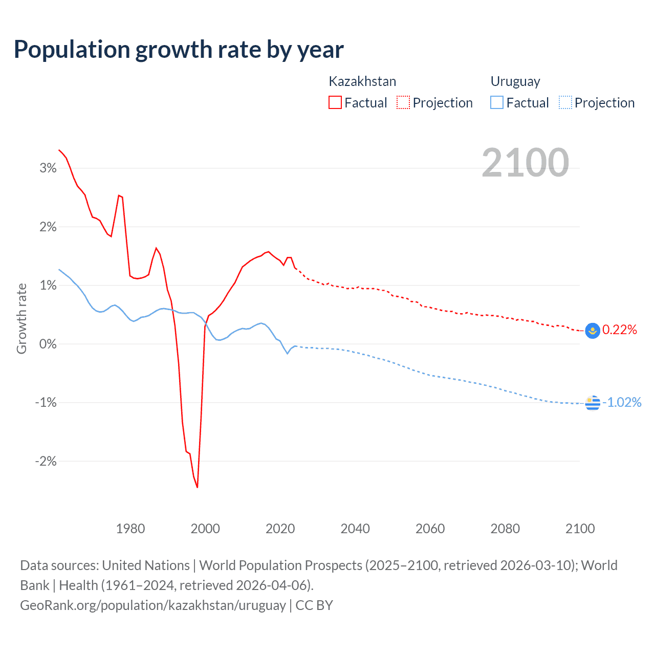 - For the last 10 years, Kazakhstan has had an average growth rate of +1.46% per year vs +0.11% in Uruguay.