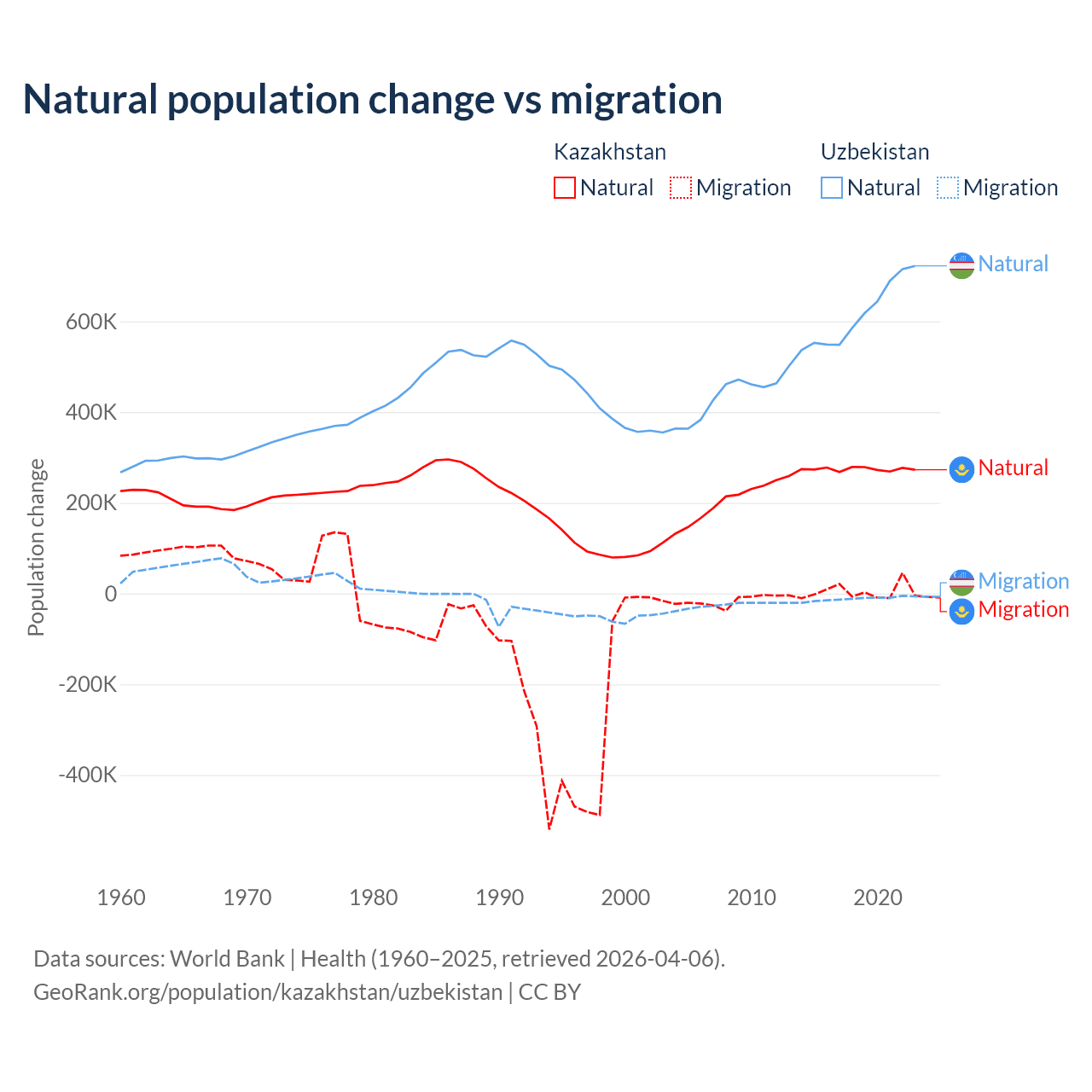 Over the last 10 years, 98.7% of the population change in Kazakhstan is from natural causes (a gain of 2,743,094 people) and 1.33% is from migration (a gain of 36,908 people). In Uzbekistan 98.2% is from natural causes (a gain of 6,161,117 people) and 1.84% is from migration (a loss of 115,398 people).