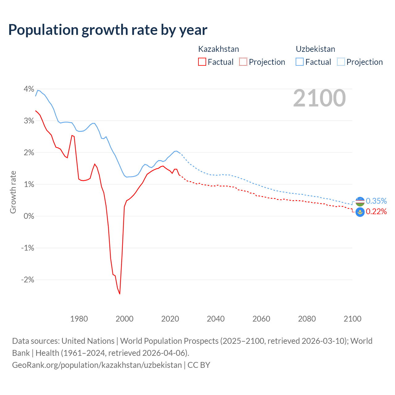 - For the last 10 years, Kazakhstan has had an average growth rate of +1.46% per year vs +1.85% in Uzbekistan.