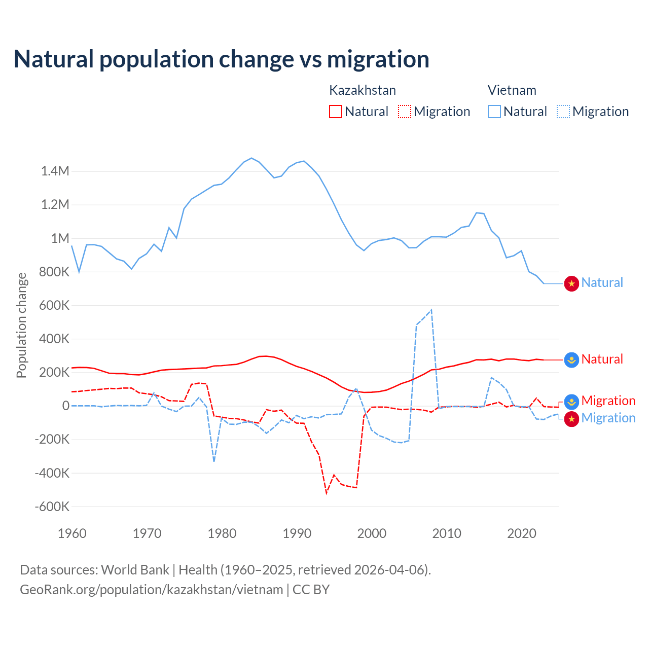 Over the last 10 years, 98.7% of the population change in Kazakhstan is from natural causes (a gain of 2,743,094 people) and 1.33% is from migration (a gain of 36,908 people). In Vietnam 97.7% is from natural causes (a gain of 9,349,756 people) and 2.29% is from migration (a gain of 219,073 people).
