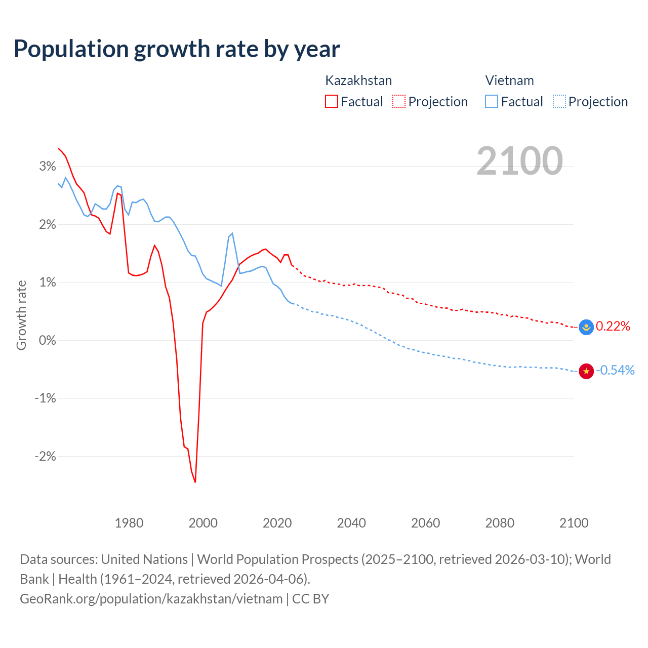 - For the last 10 years, Kazakhstan has had an average growth rate of +1.46% per year vs +0.99% in Vietnam.
