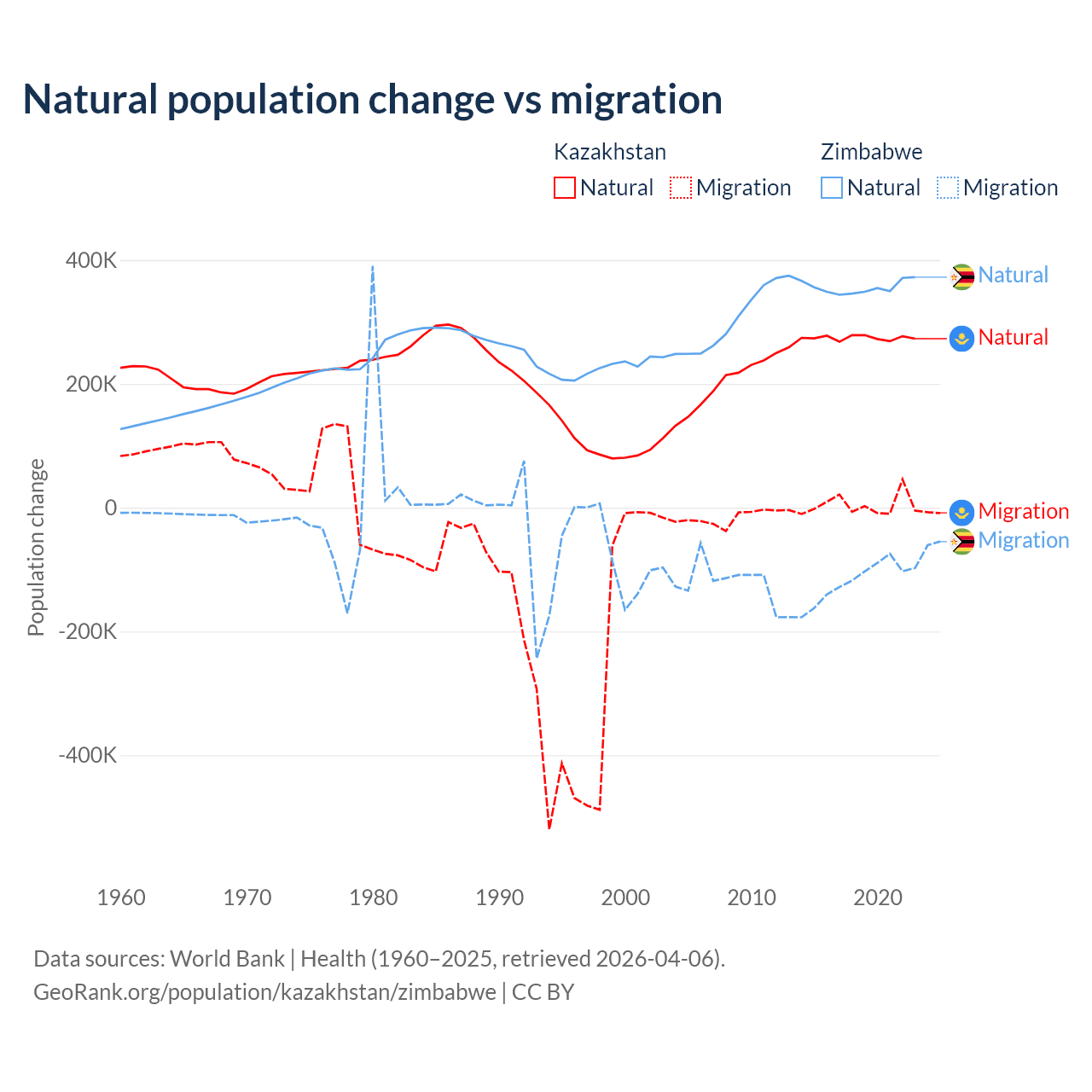 Over the last 10 years, 98.7% of the population change in Kazakhstan is from natural causes (a gain of 2,743,094 people) and 1.33% is from migration (a gain of 36,908 people). In Zimbabwe 74.9% is from natural causes (a gain of 3,558,487 people) and 25.1% is from migration (a loss of 1,192,807 people).