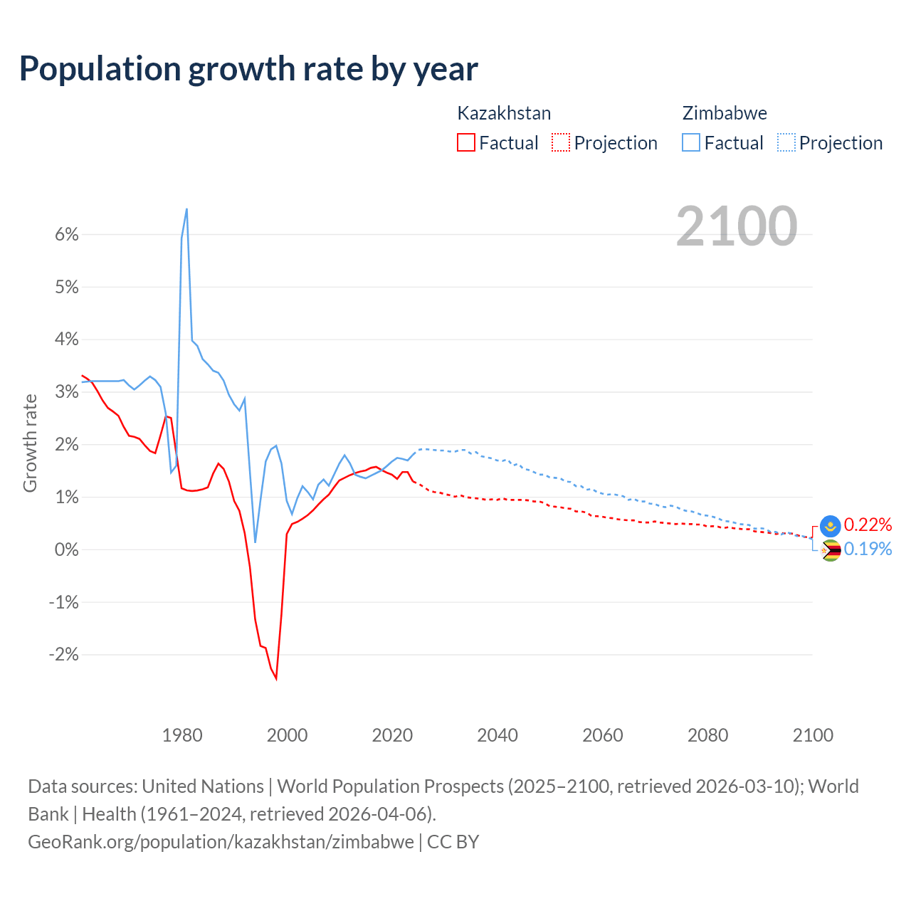 - For the last 10 years, Kazakhstan has had an average growth rate of +1.46% per year vs +1.57% in Zimbabwe.