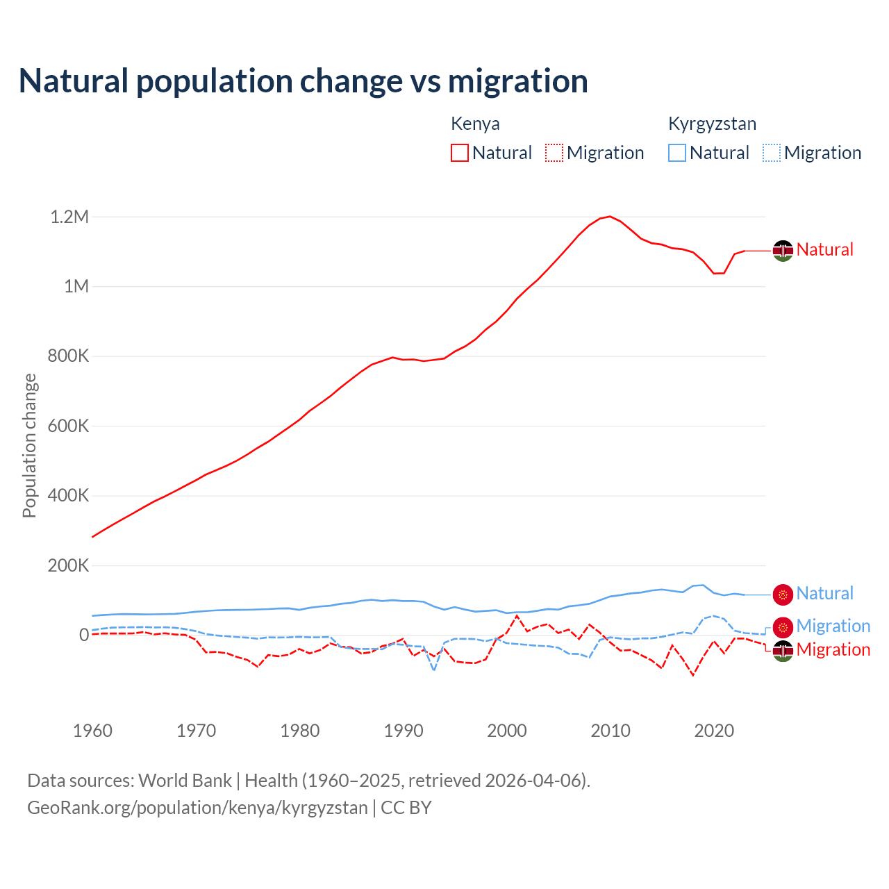 Over the last 10 years, 95.3% of the population change in Kenya is from natural causes (a gain of 10,892,362 people) and 4.67% is from migration (a loss of 533,876 people). In Kyrgyzstan 88.5% is from natural causes (a gain of 1,258,837 people) and 11.5% is from migration (a gain of 164,132 people).