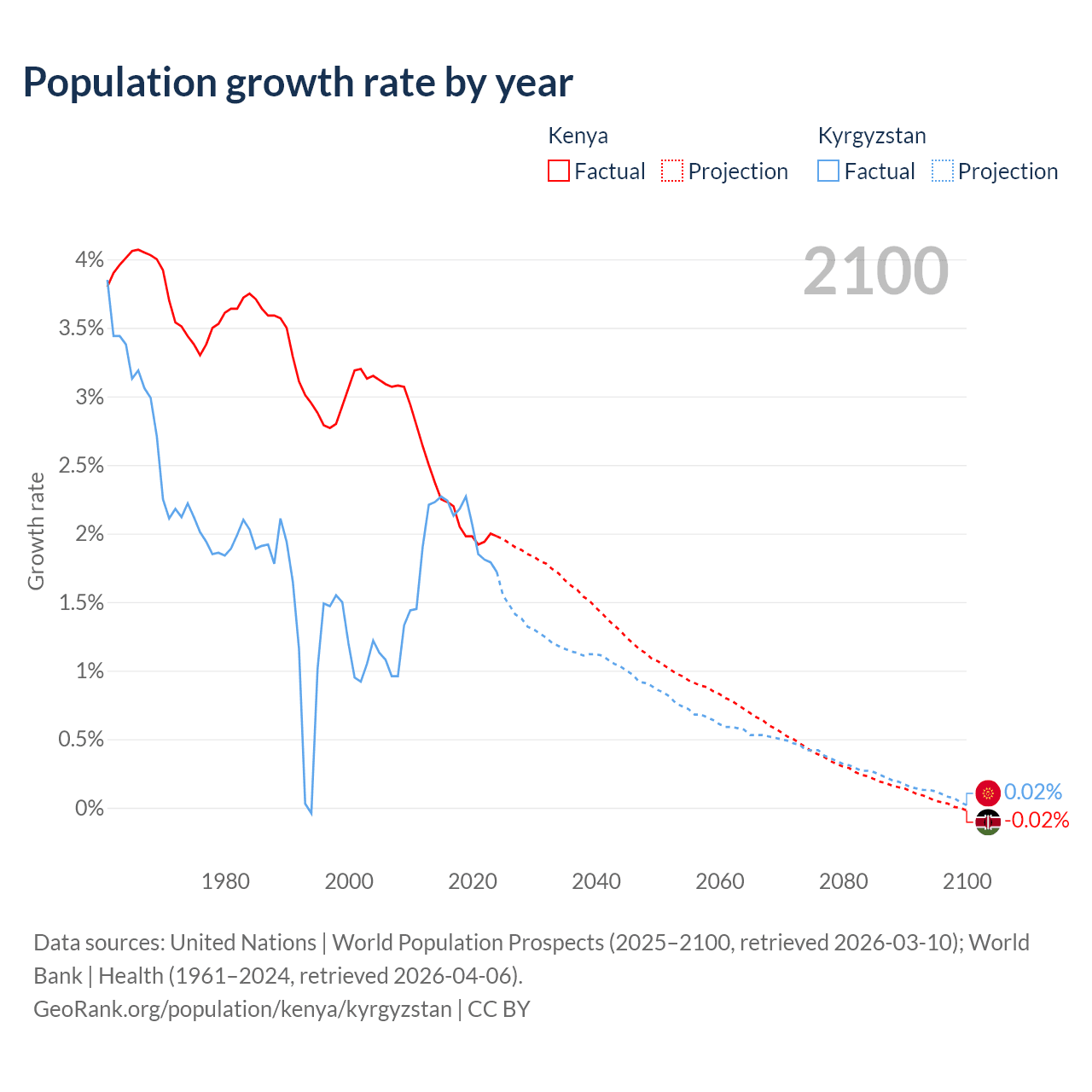 - For the last 10 years, Kenya has had an average growth rate of +2.08% per year vs +2.05% in Kyrgyzstan.