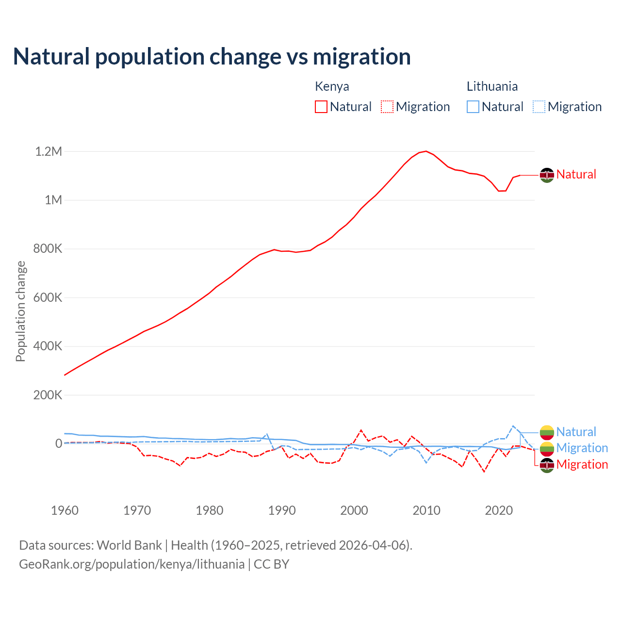 Over the last 10 years, 95.3% of the population change in Kenya is from natural causes (a gain of 10,892,362 people) and 4.67% is from migration (a loss of 533,876 people). In Lithuania 68.7% is from natural causes (a loss of 153,859 people) and 31.3% is from migration (a gain of 70,196 people).