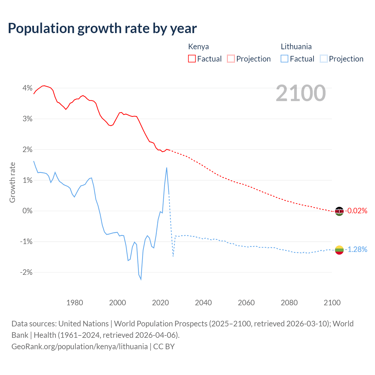- For the last 10 years, Kenya has had an average growth rate of +2.08% per year vs -0.22% in Lithuania.