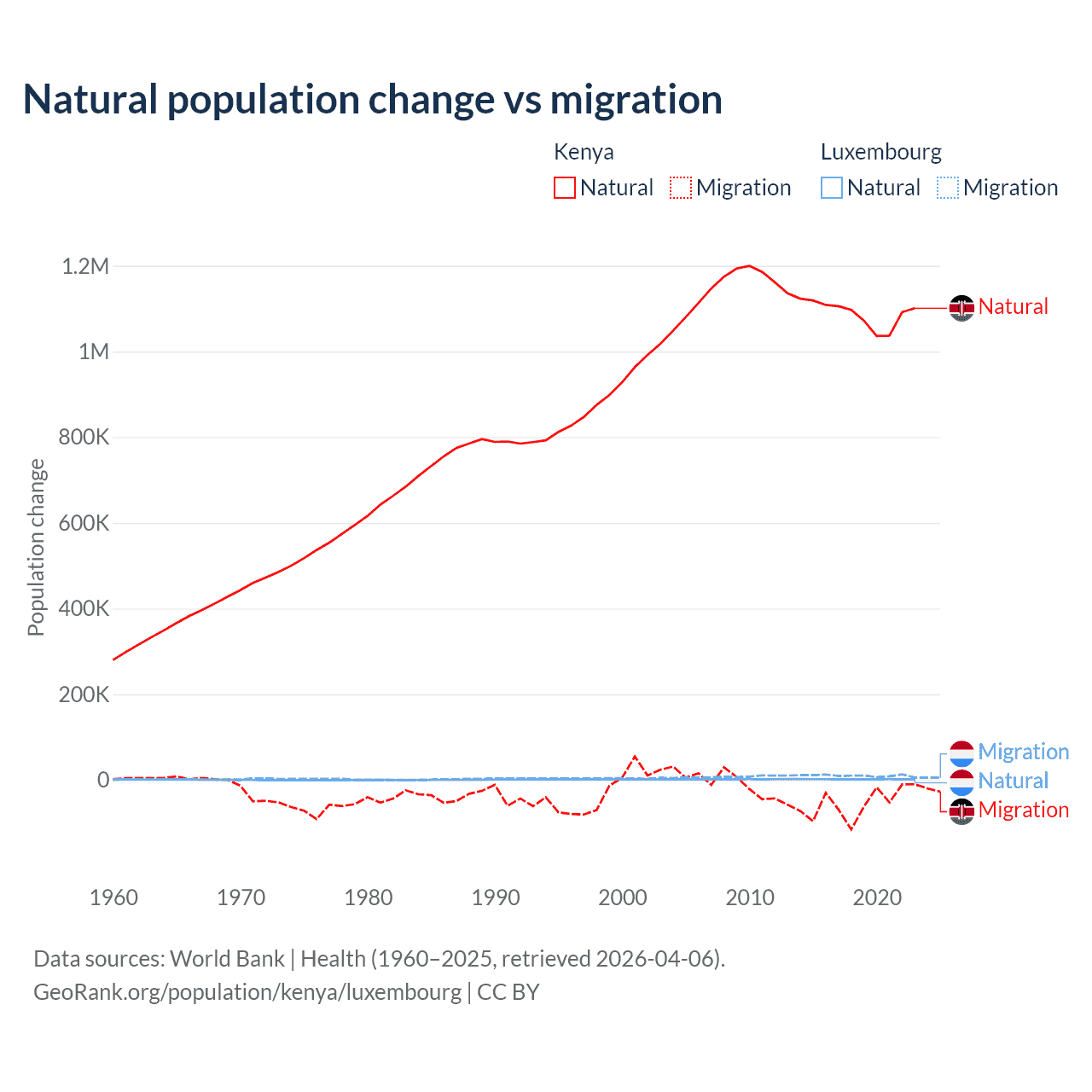 Over the last 10 years, 95.3% of the population change in Kenya is from natural causes (a gain of 10,892,362 people) and 4.67% is from migration (a loss of 533,876 people). In Luxembourg 16.8% is from natural causes (a gain of 20,287 people) and 83.2% is from migration (a gain of 100,435 people).
