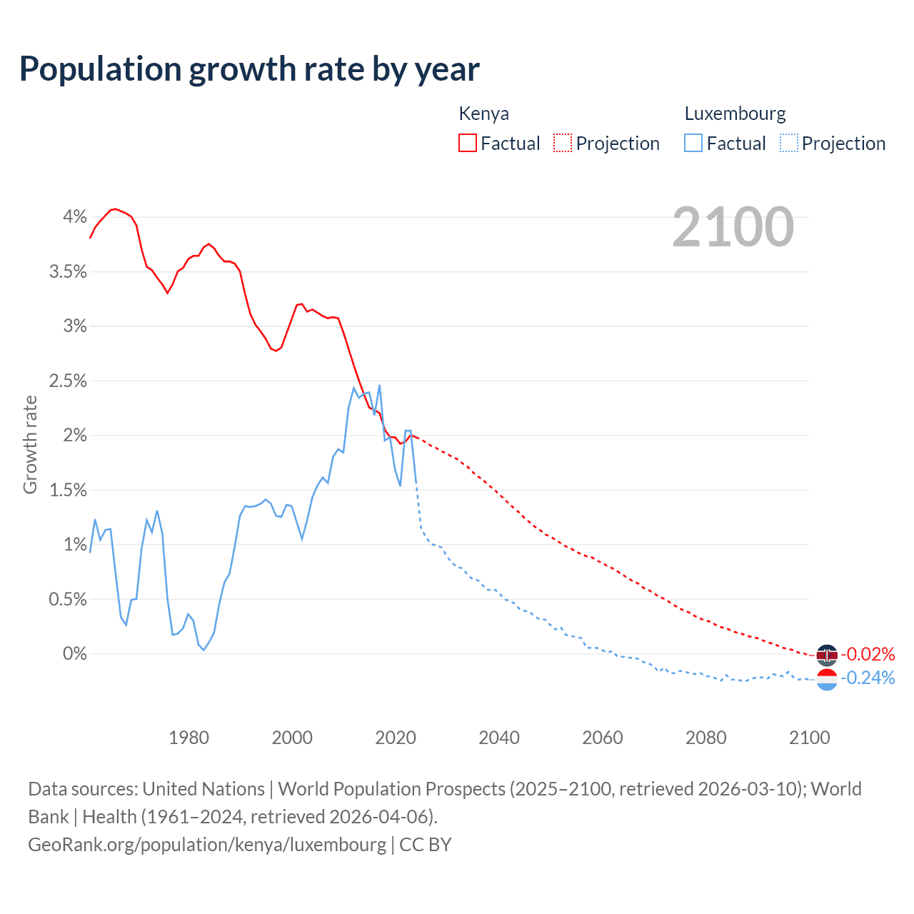 - For the last 10 years, Kenya has had an average growth rate of +2.08% per year vs +2.02% in Luxembourg.
