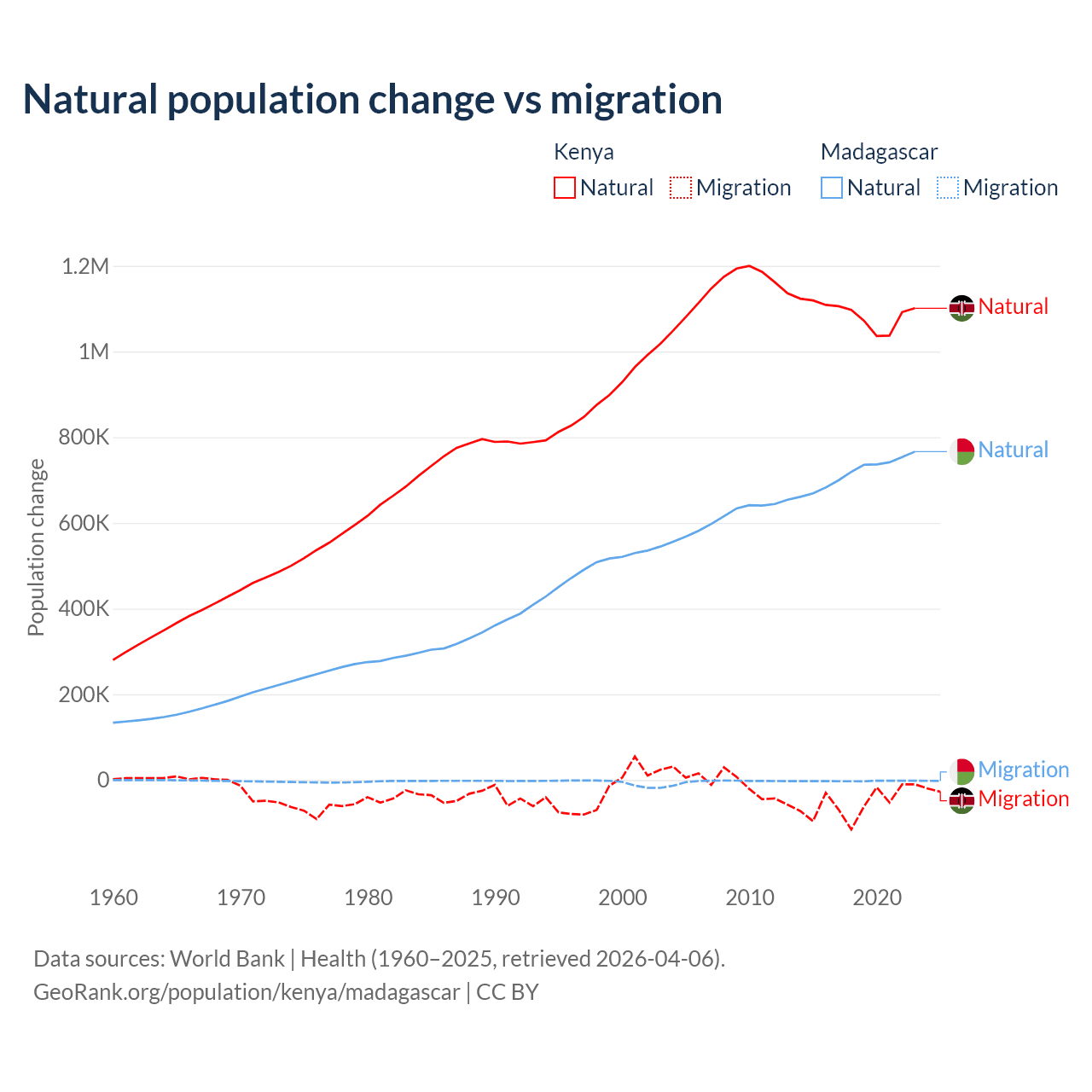 Over the last 10 years, 95.3% of the population change in Kenya is from natural causes (a gain of 10,892,362 people) and 4.67% is from migration (a loss of 533,876 people). In Madagascar 99.7% is from natural causes (a gain of 7,165,578 people) and 0.31% is from migration (a loss of 22,384 people).