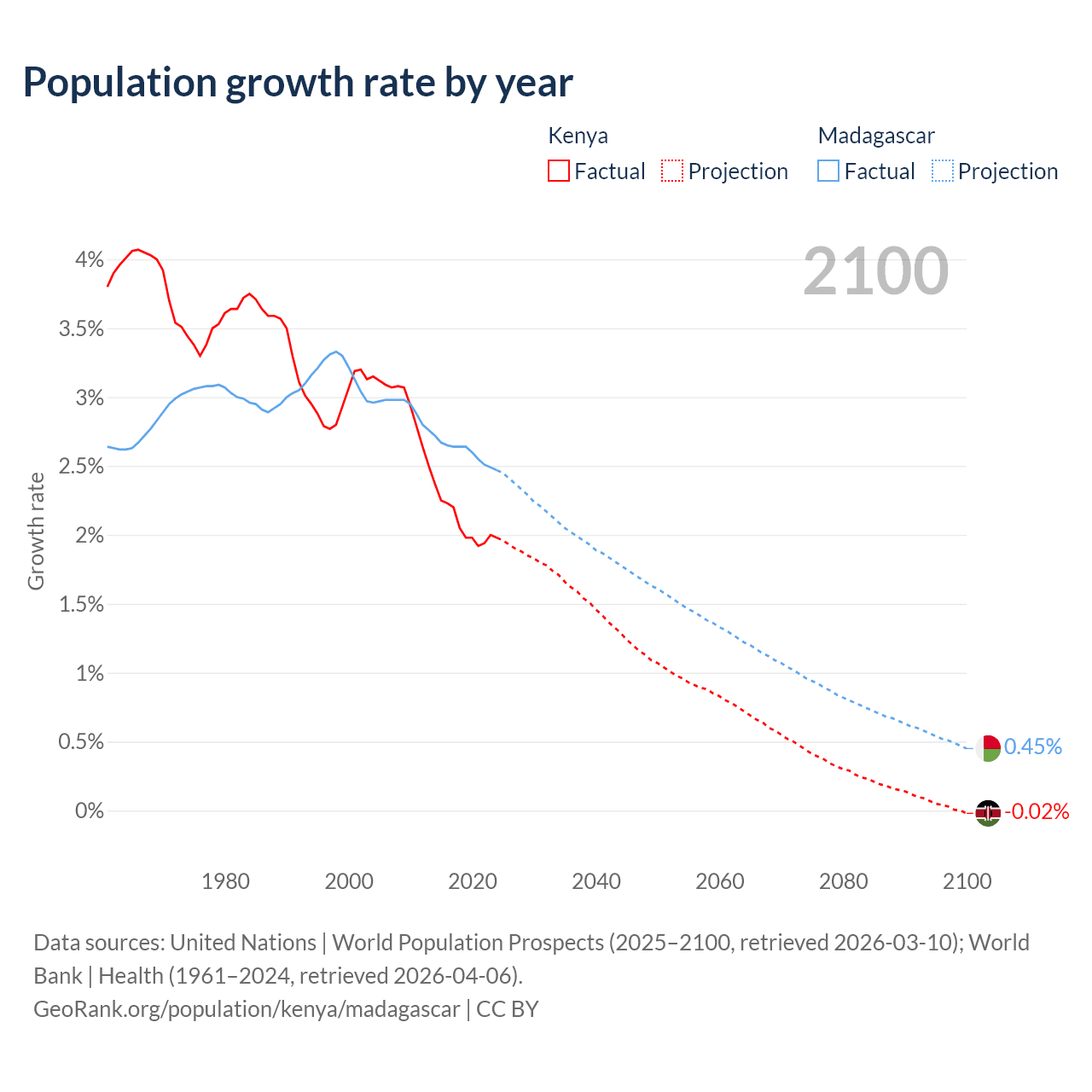 - For the last 10 years, Kenya has had an average growth rate of +2.08% per year vs +2.6% in Madagascar.