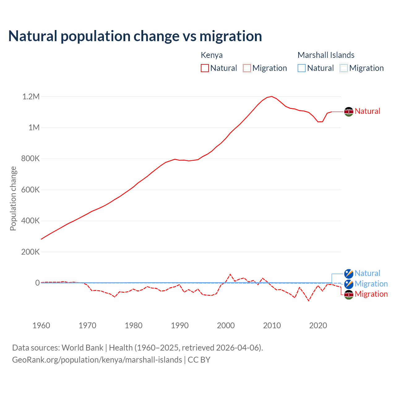Over the last 10 years, 95.3% of the population change in Kenya is from natural causes (a gain of 10,892,362 people) and 4.67% is from migration (a loss of 533,876 people). In the Marshall Islands 27.8% is from natural causes (a gain of 7,592 people) and 72.2% is from migration (a loss of 19,682 people).