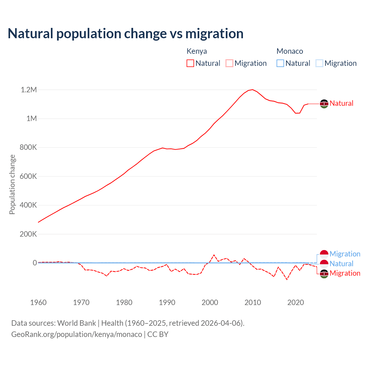Over the last 10 years, 95.3% of the population change in Kenya is from natural causes (a gain of 10,892,362 people) and 4.67% is from migration (a loss of 533,876 people). In Monaco 37.3% is from natural causes (a loss of 4,357 people) and 62.7% is from migration (a gain of 7,333 people).