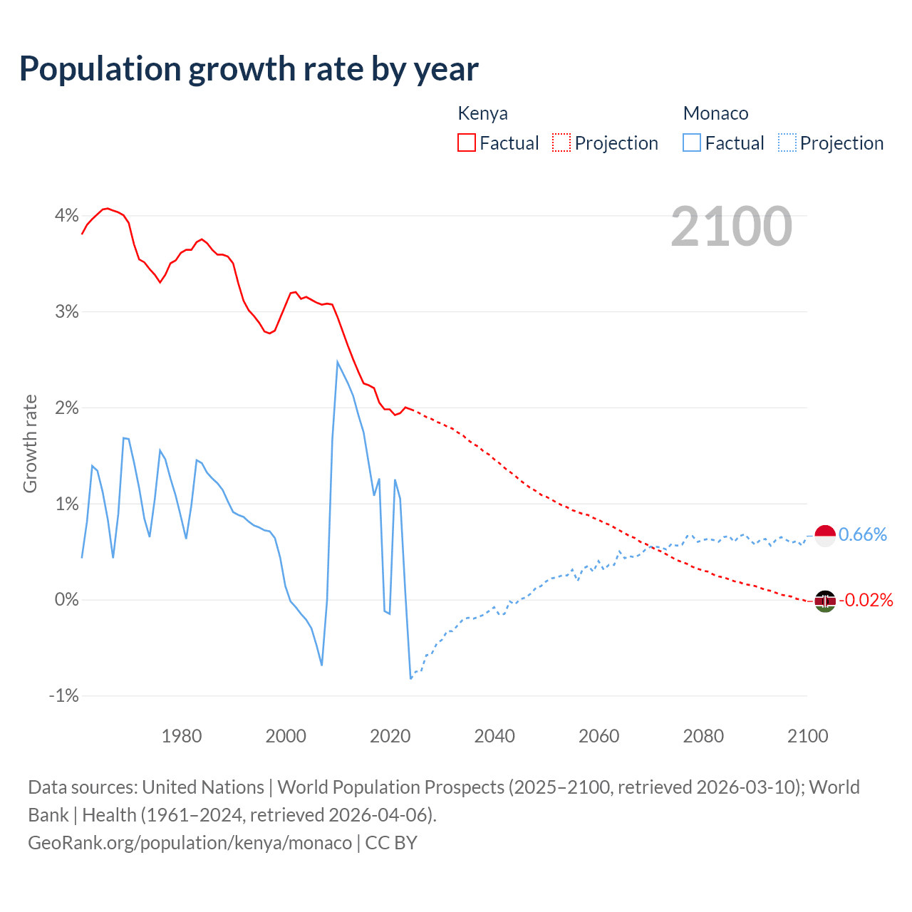 - For the last 10 years, Kenya has had an average growth rate of +2.08% per year vs +0.79% in Monaco.