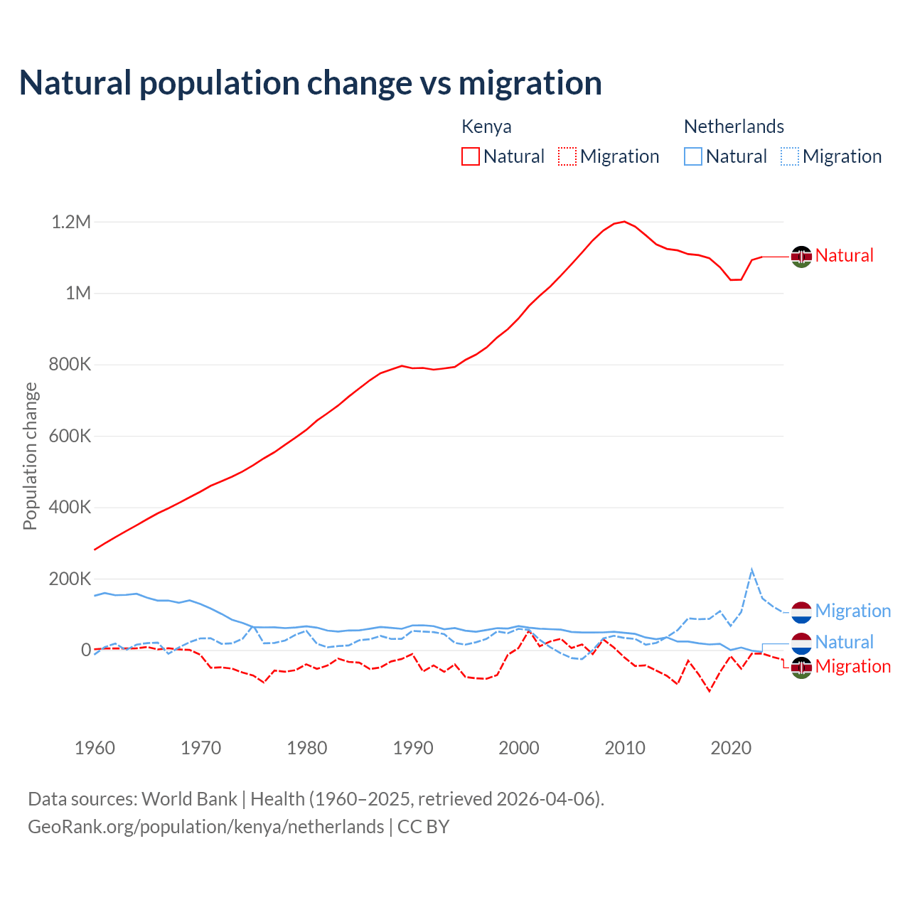 Over the last 10 years, 95.3% of the population change in Kenya is from natural causes (a gain of 10,892,362 people) and 4.67% is from migration (a loss of 533,876 people). In the Netherlands 11.8% is from natural causes (a gain of 134,554 people) and 88.2% is from migration (a gain of 1,006,495 people).