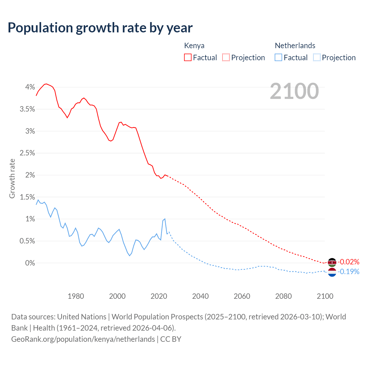 - For the last 10 years, Kenya has had an average growth rate of +2.08% per year vs +0.62% in the Netherlands.