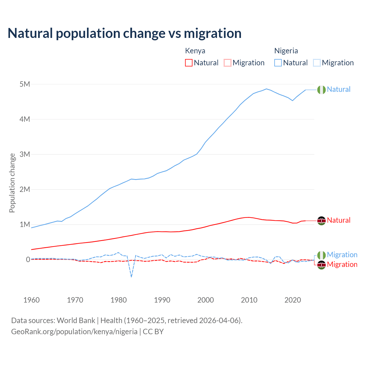 Over the last 10 years, 95.3% of the population change in Kenya is from natural causes (a gain of 10,892,362 people) and 4.67% is from migration (a loss of 533,876 people). In Nigeria 99.2% is from natural causes (a gain of 47,163,517 people) and 0.77% is from migration (a loss of 368,103 people).