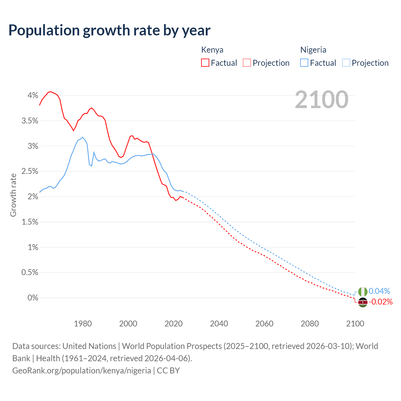 - For the last 10 years, Kenya has had an average growth rate of +2.08% per year vs +2.31% in Nigeria.