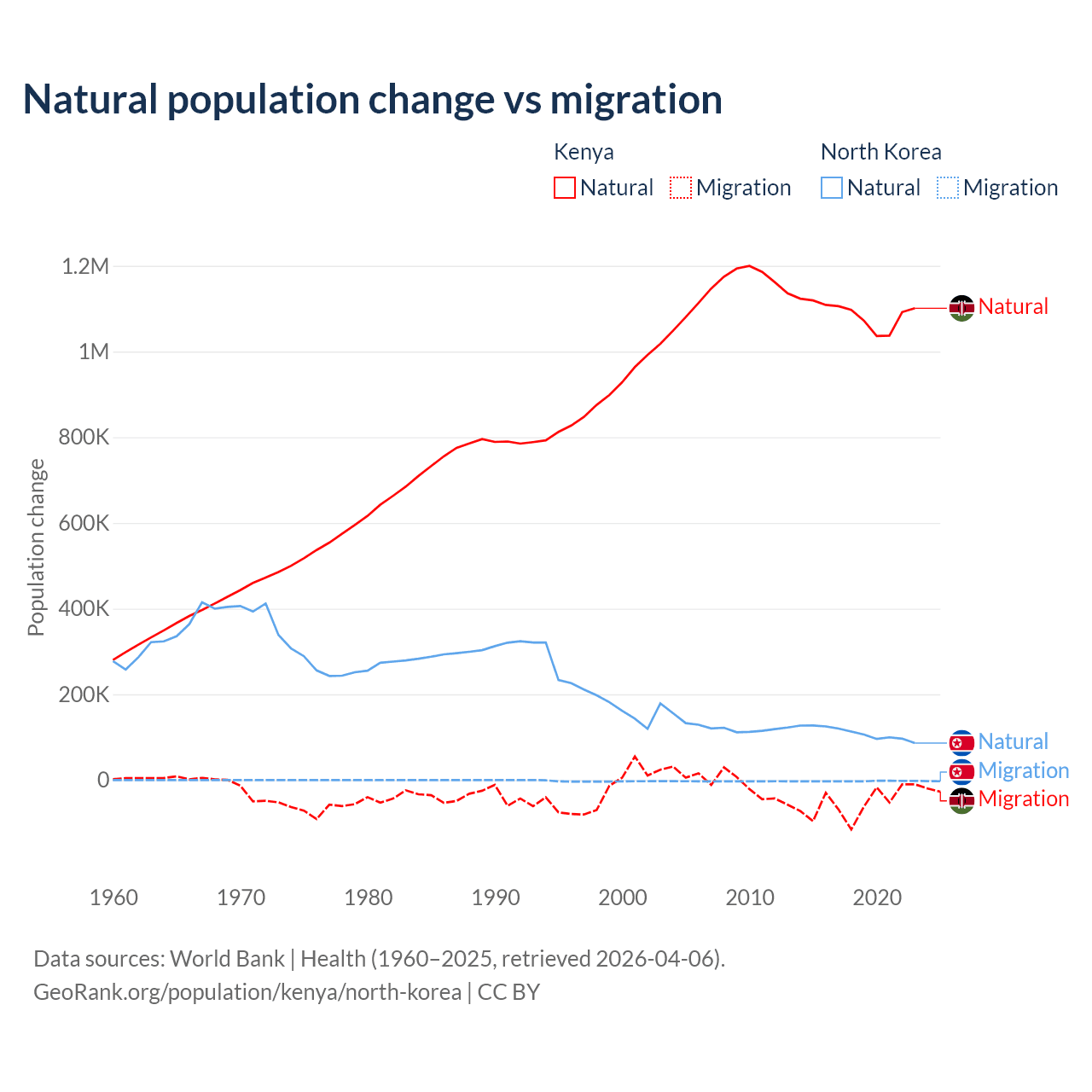 Over the last 10 years, 95.3% of the population change in Kenya is from natural causes (a gain of 10,892,362 people) and 4.67% is from migration (a loss of 533,876 people). In North Korea 97.7% is from natural causes (a gain of 1,097,372 people) and 2.33% is from migration (a loss of 26,227 people).