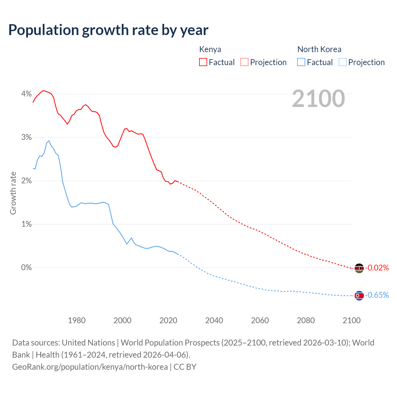 - For the last 10 years, Kenya has had an average growth rate of +2.08% per year vs +0.41% in North Korea.