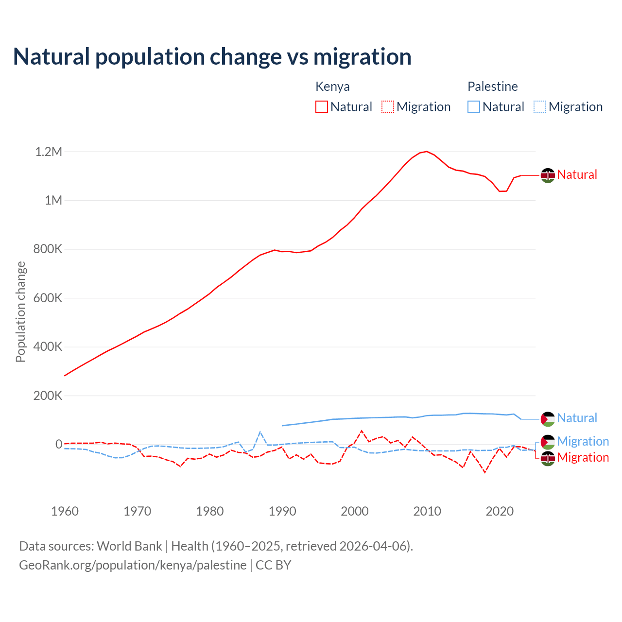 Over the last 10 years, 95.3% of the population change in Kenya is from natural causes (a gain of 10,892,362 people) and 4.67% is from migration (a loss of 533,876 people). In Palestine 85.7% is from natural causes (a gain of 1,218,010 people) and 14.3% is from migration (a loss of 202,820 people).