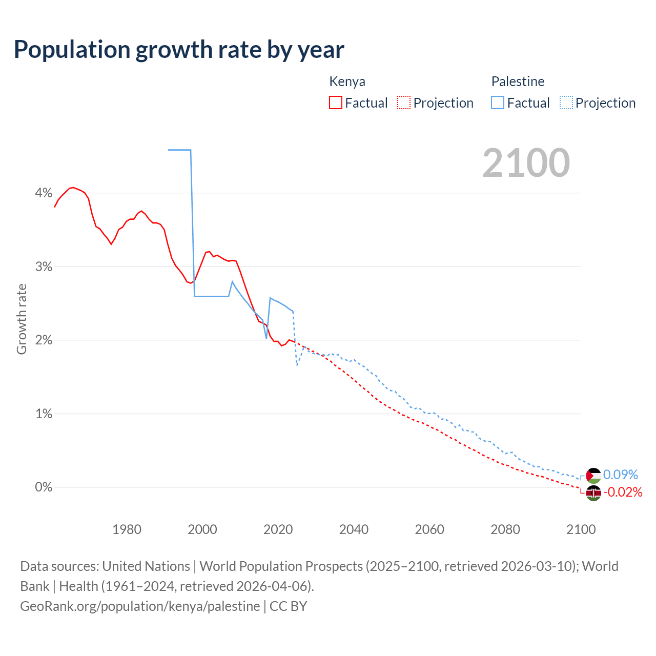 - For the last 10 years, Kenya has had an average growth rate of +2.08% per year vs +2.4% in Palestine.