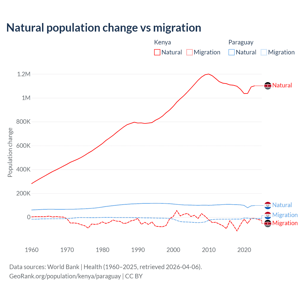 Over the last 10 years, 95.3% of the population change in Kenya is from natural causes (a gain of 10,892,362 people) and 4.67% is from migration (a loss of 533,876 people). In Paraguay 87.6% is from natural causes (a gain of 1,002,636 people) and 12.4% is from migration (a loss of 141,377 people).