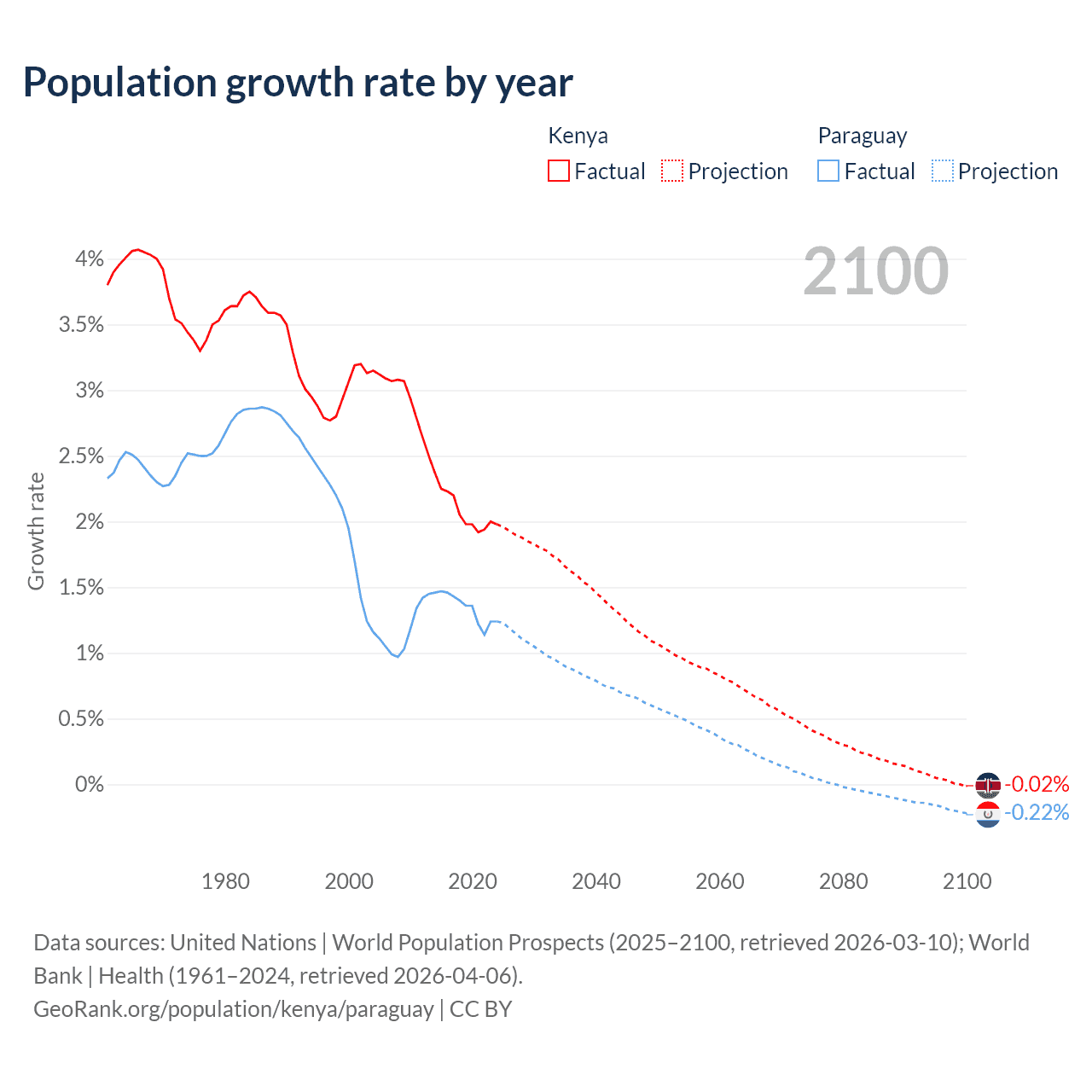 - For the last 10 years, Kenya has had an average growth rate of +2.08% per year vs +1.34% in Paraguay.