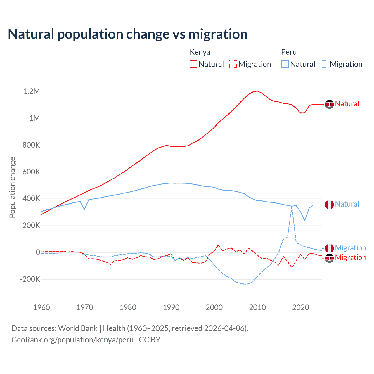 Over the last 10 years, 95.3% of the population change in Kenya is from natural causes (a gain of 10,892,362 people) and 4.67% is from migration (a loss of 533,876 people). In Peru 82% is from natural causes (a gain of 3,345,822 people) and 18% is from migration (a gain of 732,505 people).