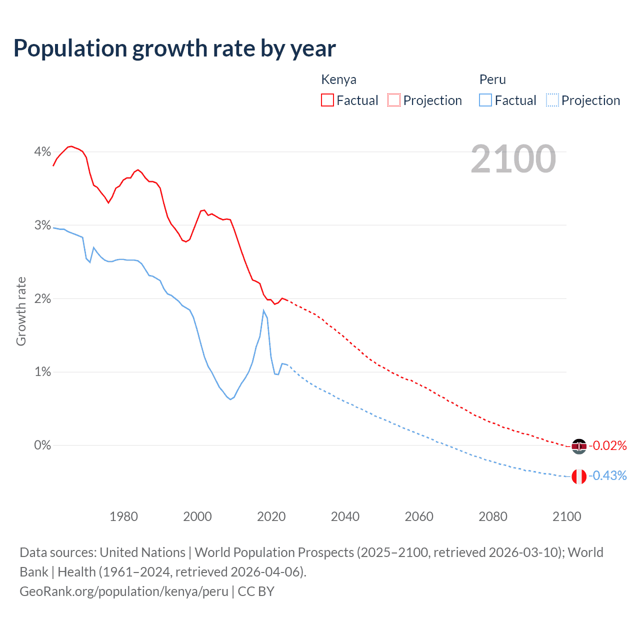 - For the last 10 years, Kenya has had an average growth rate of +2.08% per year vs +1.26% in Peru.