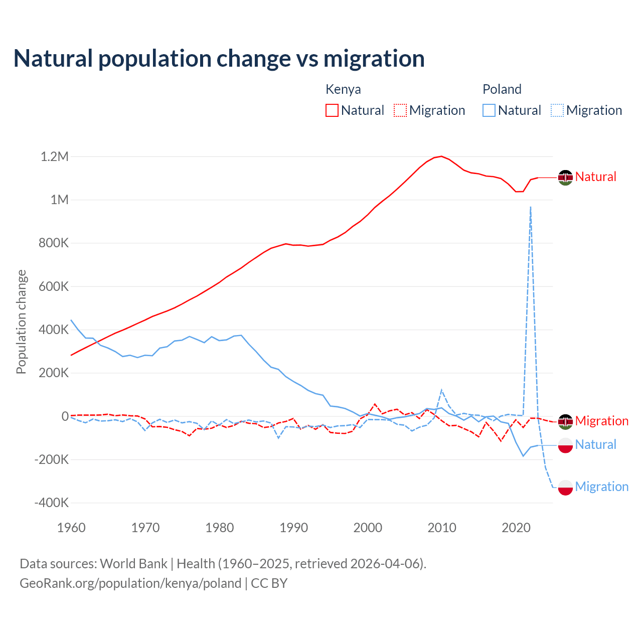 Over the last 10 years, 95.3% of the population change in Kenya is from natural causes (a gain of 10,892,362 people) and 4.67% is from migration (a loss of 533,876 people). In Poland 41.4% is from natural causes (a loss of 675,443 people) and 58.6% is from migration (a gain of 955,766 people).