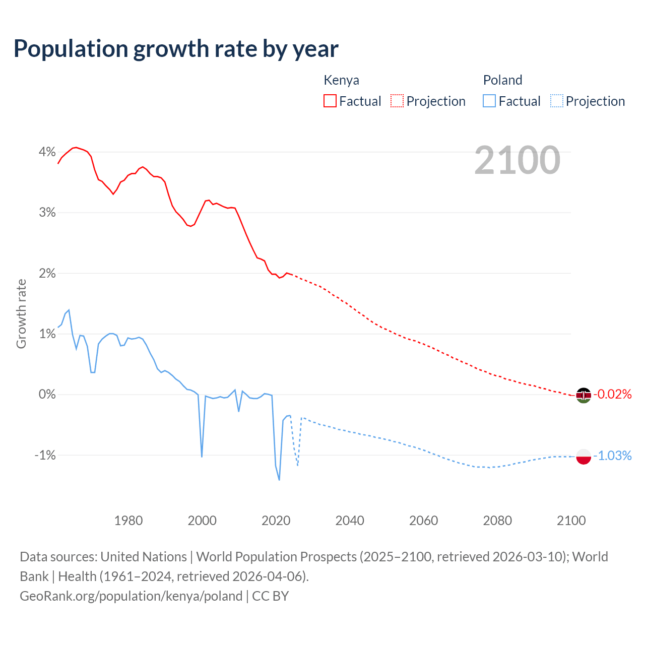 - For the last 10 years, Kenya has had an average growth rate of +2.08% per year vs -0.36% in Poland.
