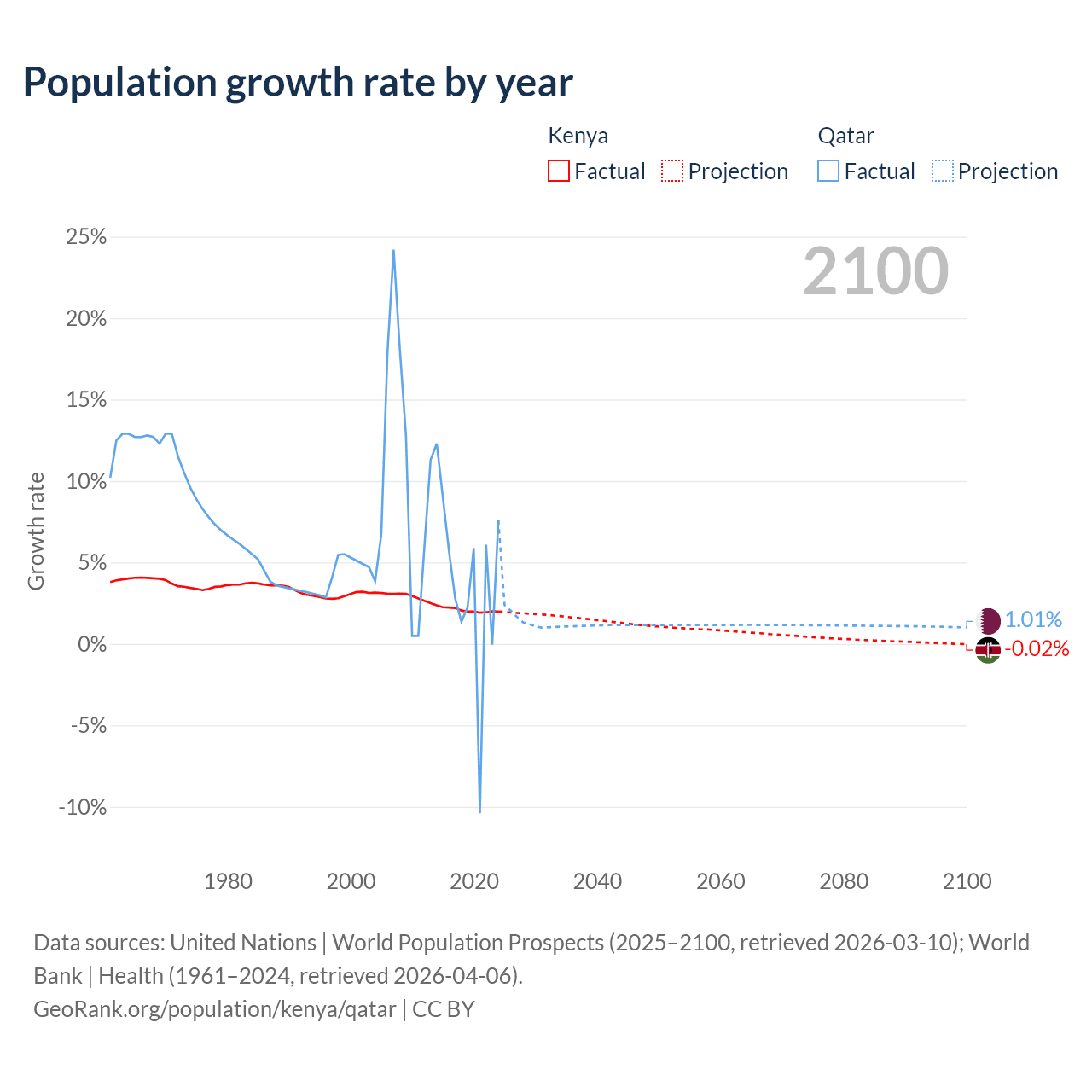 - For the last 10 years, Kenya has had an average growth rate of +2.08% per year vs +3.86% in Qatar.