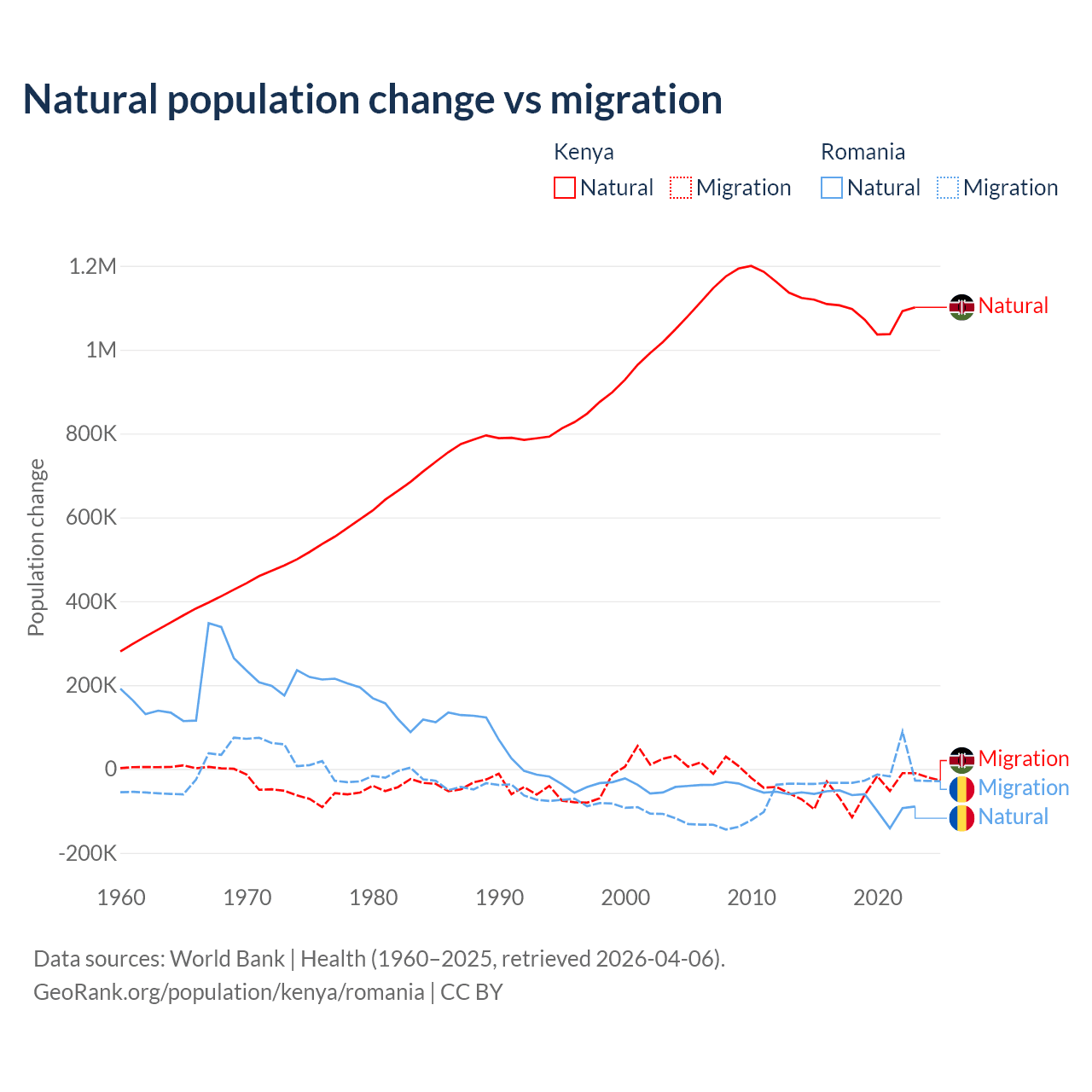 Over the last 10 years, 95.3% of the population change in Kenya is from natural causes (a gain of 10,892,362 people) and 4.67% is from migration (a loss of 533,876 people). In Romania 82% is from natural causes (a loss of 766,295 people) and 18% is from migration (a loss of 167,917 people).