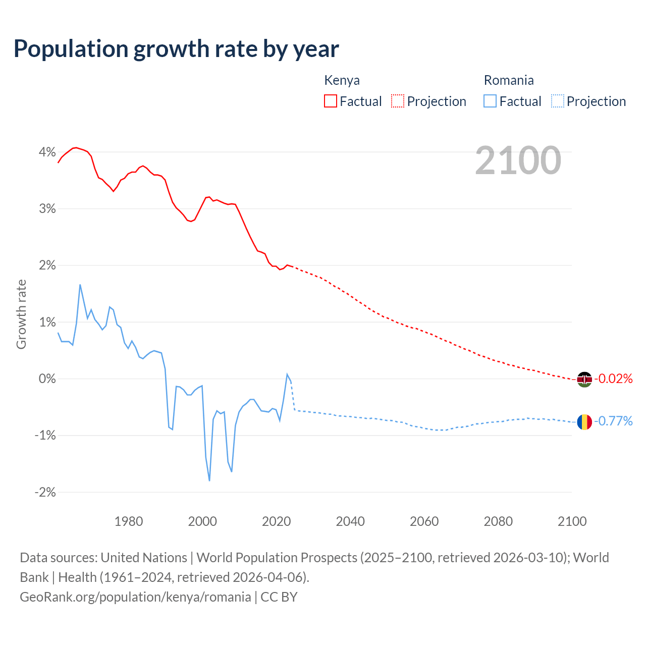 - For the last 10 years, Kenya has had an average growth rate of +2.08% per year vs -0.43% in Romania.