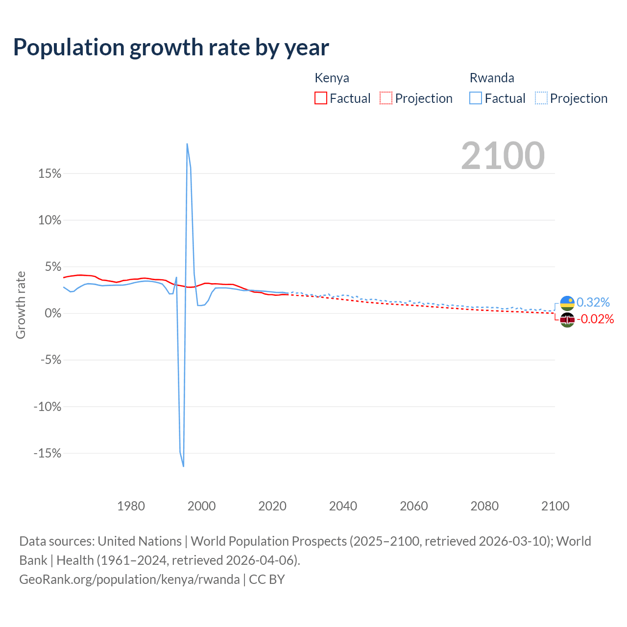- For the last 10 years, Kenya has had an average growth rate of +2.08% per year vs +2.31% in Rwanda.