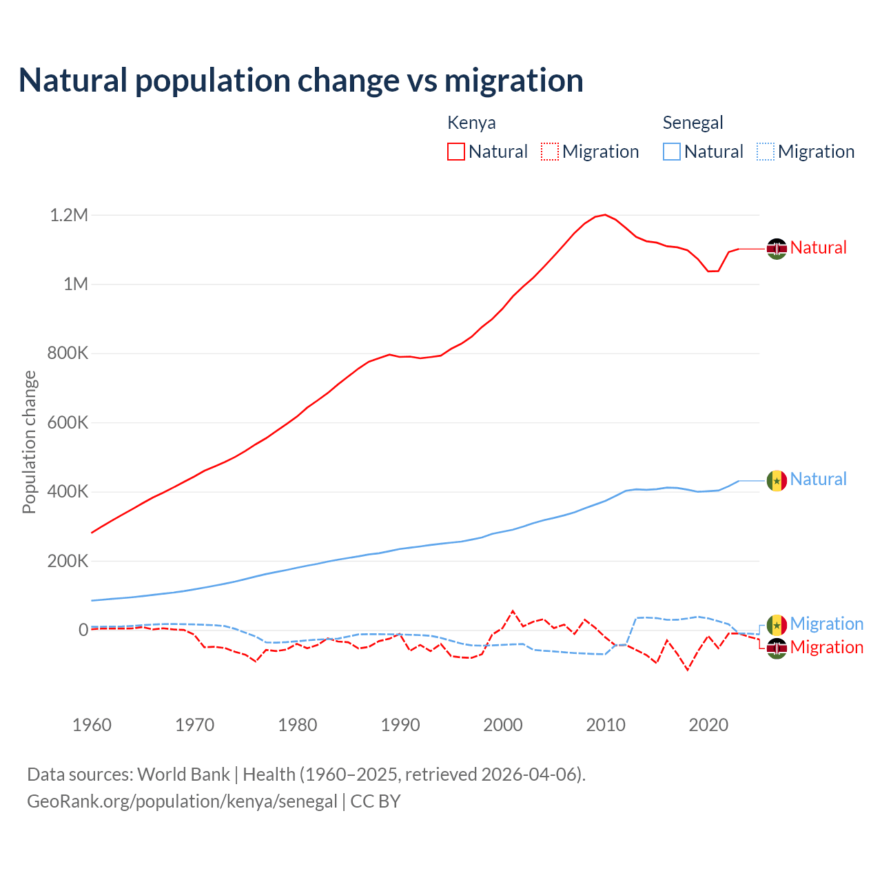 Over the last 10 years, 95.3% of the population change in Kenya is from natural causes (a gain of 10,892,362 people) and 4.67% is from migration (a loss of 533,876 people). In Senegal 93.9% is from natural causes (a gain of 4,089,205 people) and 6.13% is from migration (a gain of 267,266 people).
