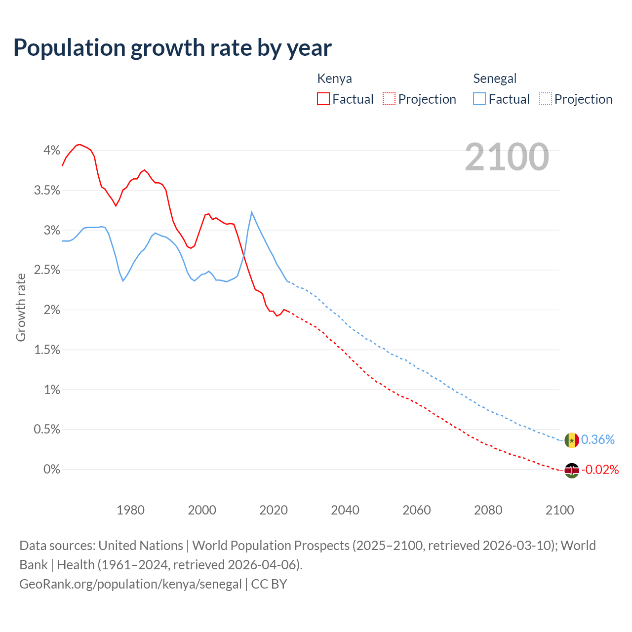 - For the last 10 years, Kenya has had an average growth rate of +2.08% per year vs +2.76% in Senegal.