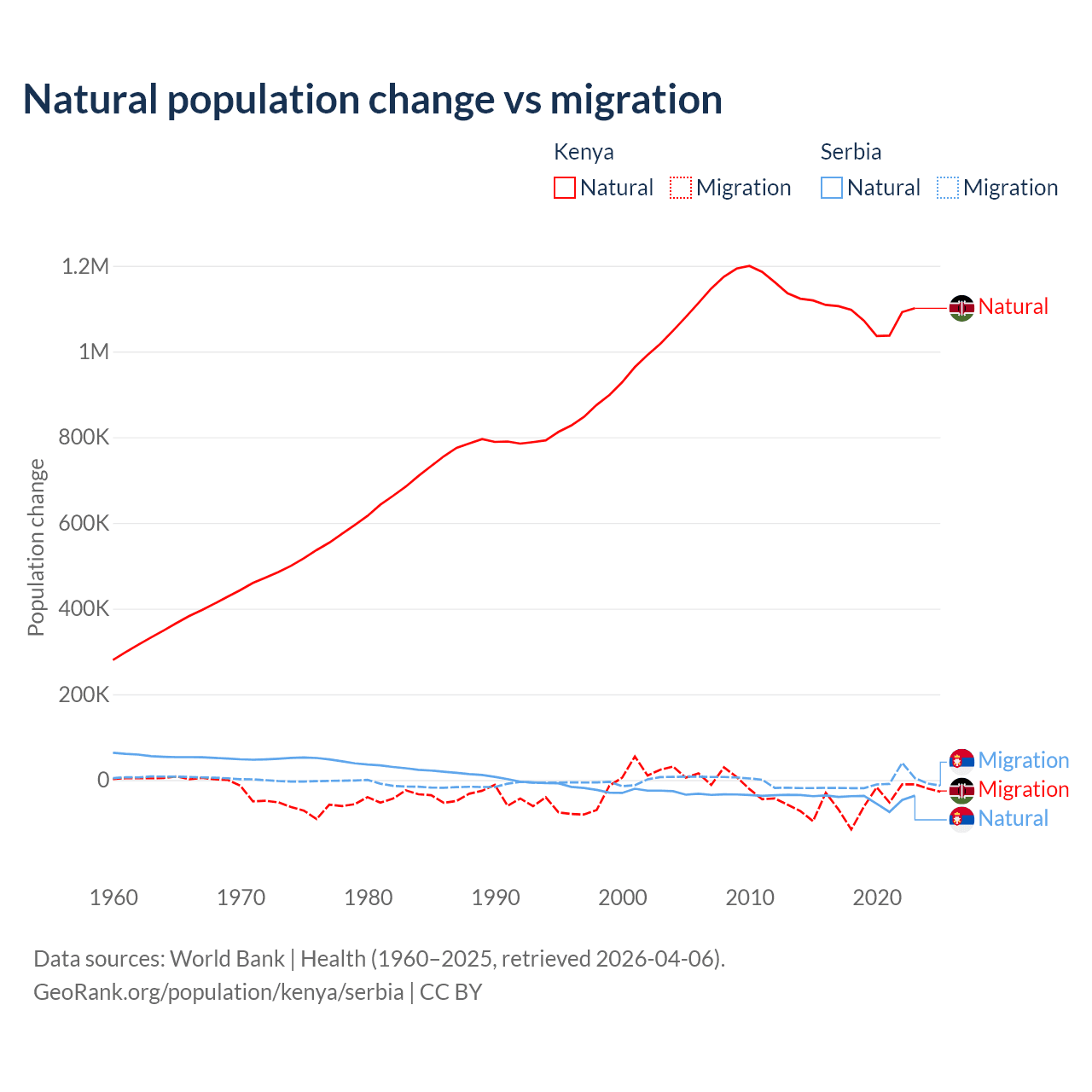 Over the last 10 years, 95.3% of the population change in Kenya is from natural causes (a gain of 10,892,362 people) and 4.67% is from migration (a loss of 533,876 people). In Serbia 83.3% is from natural causes (a loss of 435,148 people) and 16.7% is from migration (a loss of 87,110 people).
