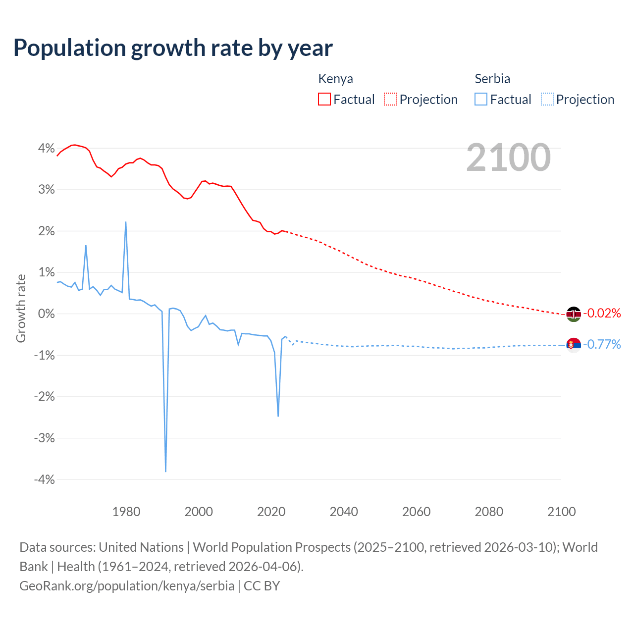 - For the last 10 years, Kenya has had an average growth rate of +2.08% per year vs -0.76% in Serbia.